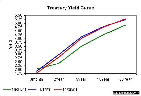 As the chart shows, yields all moved up save the 3-month bill, as the trend in the fixed-income market is now negative. A strengthening economy translates into falling bond prices, and rising yields, because it is accompanied by growing borrowing demands. The negative movement in GDP reported on November 30th and rate-cut friendly comments coming from a few Fed governors helped moved yields slightly lower at the end of the month. As a result, the yield curve was slightly lower at the end of the month than on the 15th of the month. Yields were still much higher for the month of November. At the longer end of the curve, the 30-year bond increased 39 basis points in November after reaching its lowest yield since 1993. The 10-year note gained 48 basis points for the month, reversing last month's drop. At the shorter end of the curve, the 5-year note increased by 51 basis points; the 2-year note rose 40 basis points and the 3-month bill moved in the opposite direction, down 25 basis points in November.