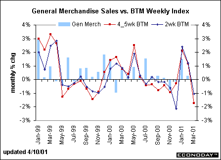 The chart below depicts monthly changes in the general merchandise component of retail sales (which consists primarily of department stores) and compares these changes to the weekly BTM index. We have derived two versions of the BTM series. First, we look at two weeks worth of data for each month relative to the previous month's average; then, we look at the entire month's average of the BTM index (either four or five weeks). Not surprisingly, the two BTM series move in tandem - although the first two weeks of the month can overstate or understate what the entire month's BTM index suggests. For instance, in March, the first two weeks of the month showed a 1.2 percent drop in same-store sales, but the four-five week index declined 1.7 percent. We won't know which is closer to the truth until the March retail sales report is released on April 12.
