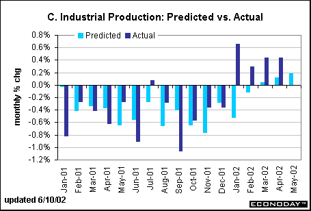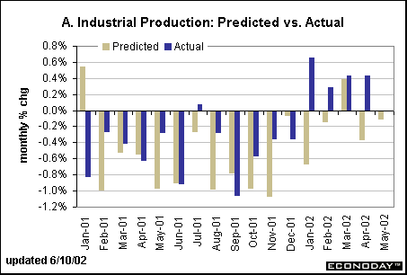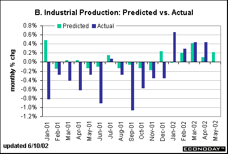 | Economists weren’t too happy with last week’s employment report. It set the tone for what will likely be soggy economic figures all month long. We’ve made that claim before – that the employment report is often out in front of other economic indicators. Why is this? Partly, the employment statistics are one measure of production in the economy. In fact, one can use the employment report to actually predict the index of industrial production, which is reported seven to 10 days later. No Frill Approach When I was an economic forecaster, I made a practice of using several models to predict the same variable. Economic modeling isn’t perfect and the same model doesn’t work all the time. Moreover, it is useful to see what the range of results might be. For industrial production, three models give a fairly good estimate for the month. The chart below is the no frills method. It basically uses factory payrolls and the factory workweek without applying fancy statistical models. Multiply the level of payrolls with the average manufacturing workweek to get total manufacturing hours worked. Then compare the percent change in hours worked with the previous month. This should correspond to the change in industrial production. Aside from very big misses in January 2001 and January 2002 when this approach predicted the wrong sign by a substantial magnitude, most of the time it gives the general direction. One of the problems is that this method doesn’t account for even-trend productivity.  Using Statistical Methods Our first foray into statistical modeling uses exactly the same variables as before (factory workweek and payrolls) and in the same fashion. Using simple regression techniques, our independent variable is total person-hours in manufacturing. A constant is also applied, serving as the productivity variable. (Regression analysis identifies relationships between two or more series systematically.) The chart below, which compares the predicted values to the actual production figures, is almost worse than the simple no frills approach. It is true that the predicted values are pretty good over the past few months, but they are not very good for a major portion of the 18-month period. One of the problems is that we are assuming that employment and hours worked carry the same importance in the equation. In fact, they don’t.  Running another regression where the percent change in employment and the percent change in the workweek are listed separately yields a different and better equation. The chart below shows that the equation does a pretty good job of predicting production, except for January 2002, a turning point in this series.  The Bottom LinePredicting economic variables is harder than it looks even when using good statistical models. It is important to rely on more than one model as a model's accuracy changes at different times of the business cycle. For instance, Model B (the middle chart) seemed to perform better at the turning point early in January and seemed to have done a better job of predicting production in the first part of the year. However, model C was better during most of the downturn in 2001. It is important to keep in mind that these are simplistic models for predicting industrial production. We are only looking at the manufacturing sector here. Total production also includes utilities and mining. When the weather is different from normal seasonal patterns, utilities can have perverse monthly effects on production changes. Understandably, economists often monitor trends in electrical usage. So what are the models telling us for Friday’s industrial production report? The no frills model (A) suggests that production will post a drop of 0.1 percent. Models (B) and (C) both predict a rise of 0.2 percent. The consensus forecast is calling for a rise of 0.3 percent with a range of 0.1 to 0.5 percent. Six of the 18 forecasters in Market News International's survey are calling for a 0.2 percent hike. If I were making the forecast, I would probably ignore model (A) and go with a 0.2 percent hike as indicated by the other two models. |