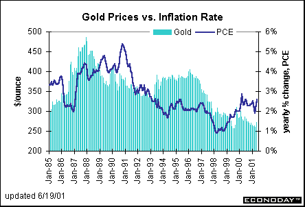 The chart below depicts daily gold prices over the past year. Prices generally fell over the course of the year until May. The weaker prices came at the same time that consumer prices were showing signs of acceleration. Yet gold bugs (those who claim that the price of gold reflects the truth about the economy and inflation, such as former Fed Governor and current Bear Stearns Chief Economist Wayne Angell) could point to declining gold prices as proof that inflation was not a problem in the U.S. economy. Declining gold prices could also indicate weaker demand for gold in general as well as for industrial use. All this together would suggest softer economic activity. Indeed, history shows that gold prices fall during recessions. If recent price gains are sustained or if gold moves up further, it could mean that economic conditions are improving and economic growth will accelerate in the second half of the year. An important caveat not to be missed: gold is an international commodity. Prices reflect global demand, not just U.S. demand. Thus, one shouldn't make quick conclusions from small data movements.