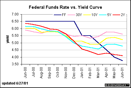 Investors often anticipate trends and it isn't unusual to see Treasury yields fall more rapidly than the federal funds rate that is governed by the Federal Reserve. In May last year, the Fed raised its target for the federal funds rate to 6.50 percent. Market players were already anticipating that the Fed would not only stop raising rates, but also eventually start to ease. The chart below shows that the fed funds target was stable between June and December, but Treasury yields fell - in some cases by more than one hundred basis points - even before the Fed decided to ease policy on January 3, 2001. Given that the Fed maintained its aggressive easing policy in the first half of the year, one would think that bond investors would react favorably and push yields down further. Indeed yields did fall on the 2-year and 5-year Treasury notes, but remained stable on the 10-year note and 30-year bond through the spring. By the time the Fed cut rates three times, yields on the longer term issues were already starting to inch up. Bond yields reflect economic conditions, but also reflect expectations of inflationary pressures. And bond investors were beginning to worry that inflation would flare up with the Fed's aggressive policy.