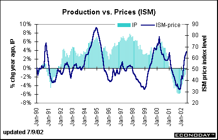 The ISM price index appears to have bottomed out early this year at the same time as industrial production. The price index has posted levels above 50 percent from March through June.