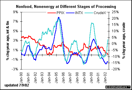 Food and energy prices fluctuate sharply and are often misleading indicators of underlying inflationary pressures. The chart below compares the producer price index at different stages of processing from crude materials to intermediate goods to finished goods excluding food and energy in each. The yearly change in crude materials prices are tied to the right axis (ranging from -20 to +25 percent) whereas the yearly change in the finished goods and intermediate goods index are tied to the left axis (ranging from -3 to +9 percent). Clearly, crude materials prices, even after accounting for the volatile food and energy components, fluctuate much more sharply than the later stages of processing. Sometimes, price hikes at the earlier stages are passed along to the finished goods index, but not always.