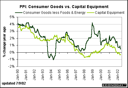 We could look at the PPI for finished goods in a different way. The chart below separates out capital equipment (27 percent share) and nonfood, nonenergy consumer goods (38 percent share) from the finished goods index. Both key components are still moderating on a year-over-year basis. It is possible that these will turn around soon, but a bottom is not yet evident from the chart below.
