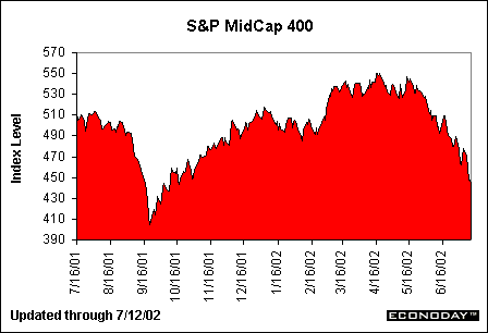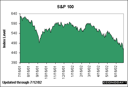 The chart above shows that major blue chips in the S&P 100 index have suffered the same trouble that the entire equity market has experienced in the past year. It is interesting to note, however, that the S&P 100 has now sunk below levels reached after the September 11th tragedy. In the earlier chart, we saw the MidCap 400 index simply approaching its September levels. This evidence highlights the fact that major blue-chip companies have been more affected by the accounting scandal than smaller companies, although the negative effect is dragging across equity indices.