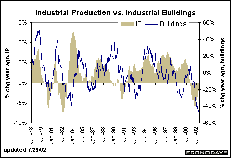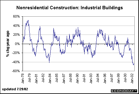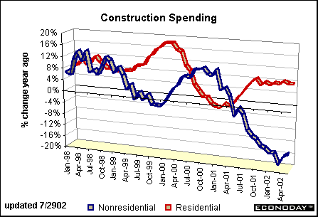 Consumer spending and residential construction have certainly played major roles in economic growth during 2001 and 2002. Growth in the housing market, if not now consistent with a bubble, is very likely to moderate over the coming year, at which time expansion in the nonresidential sector, especially office buildings and hotels & motels, may actually accelerate. It could very well be that 2003 sees investment spending as the impetus behind economic growth.