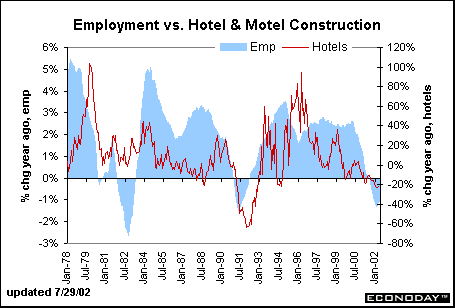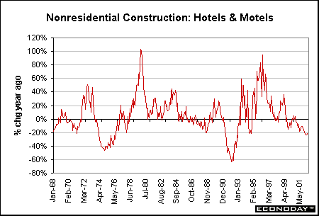 Outlook for hotel & motel construction: The hotel industry was already suffering in the early part of 2001, but took an even bigger hit after September 11. Construction has been unchanged for nearly two years. However, this pattern is in line with historical trends. Indeed, construction in this sector was unusually robust during a good chunk of the 1990s. This could mean that the absorption time will be a bit longer this time. But still, if the economy turns around in the coming year and vacancy rates decline rapidly, another round of hotel & motel construction could begin in 2003.