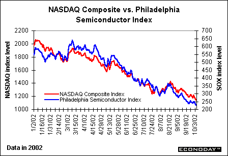 Since early 2000, then the apex of the U.S. technology boom, semiconductor stocks have fallen drastically. To see how semiconductors matched up with the technology group as a whole, let's compare the NASDAQ composite index to the Semiconductor Index.