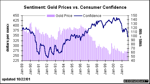 Consumer confidence plunged in the wake of the terrorist attacks on the World Trade Center and the Pentagon. The University of Michigan's consumer report for mid-October showed a slight up tick in the consumer sentiment index. A variety of more frequent polls also suggest that consumer confidence is trying to stage a mild comeback. While these confidence measures do tend to provide reliable data over time, it is important not to place too much emphasis on short-term movements. After all, a small sample of individuals is responding on their "feelings" and expectations. The plethora of ominous headlines about an economic recession is enough to frighten even the least risk averse individual.
