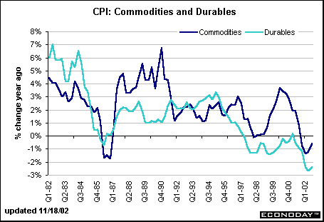Durable goods is the major component of the commodities index pushing down prices. Computers and other high tech gadgets fall under this category, along with cars and light trucks. It is useful to consider why computer and motor vehicle prices are falling so rapidly. There is no question that demand for cars and light trucks has dampened, compelling automakers to offer heavy incentives to boost sales. Consider normal economic conditions - prices of unwanted items are discounted to the point where demand is created. (If there is no demand for the particular item, then the price must be zero and it won't be produced anymore.) Computer prices have declined recently because the demand for computers has diminished after the capital spending boom of the 1990s. In addition, the cost of producing computers is coming down due to improved technological changes that have taken place over the past five years.