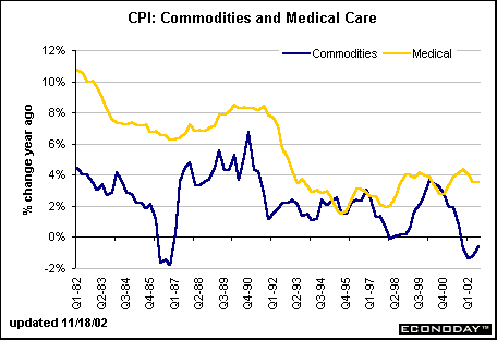 Medical care commodities (drugs, for instance) account for only 3.3 percent of the commodity price index and a mere 1.8 percent of the total CPI. Yet, despite the fact that medical care commodity prices have moderated in the 1990s, these prices are not in a declining mode these days. Rather, these costs have accelerated from their low point recorded in the fourth quarter of 1995.