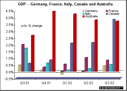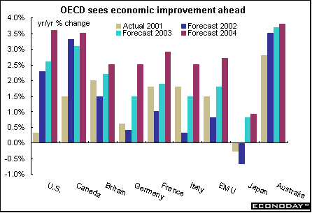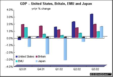 EMU - The European Monetary Union (EMU), which encompasses 12 national economies but relies on the big three - Germany, France and Italy - has been stagnant and barely growing in 2002. Part of the problem is structural. But another part of the problem is the dichotomy between fiscal and monetary policy. While the European Central Bank (ECB) governs monetary policy, fiscal policy is left to 12 individual governments who do not always see eye to eye with the ECB. Of the big three, France continues to perform better than either Italy or Germany on the strength of domestic demand. OECD's projections for the EMU are for GDP to rise a meager 0.8 percent for 2002, but bounce up 1.8 percent in 2003 and 2.7 percent in 2004.