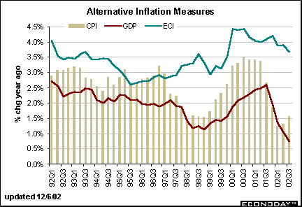 The GDP deflator showed dramatic improvement in the past five quarters, but the employment cost index tends to change more slowly over time. The CPI accelerated in the third quarter, but remains tame by historical standards.