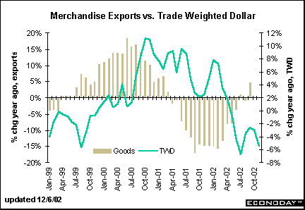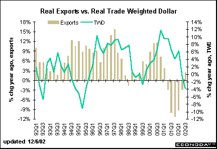 Export demand was sluggish in 1998 and 1999 as foreign economies in the throes of recession tried to get back on their feet. Export growth increased at a healthy clip in 2000 even as the foreign exchange value of the dollar appreciated. 2001 was not a good year for exports and this helped to dampen already weak domestic industrial production. The dollar was considered strong throughout 2001 and a bit of 2002, but the trade weighted dollar actually peaked in 2000.