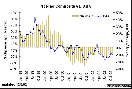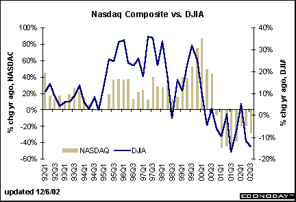 The Dow Jones Industrial Average parted company from the NASDAQ composite index in 1999. Tech stocks soared in 1999, but corrected in 2000 and 2001. The Nasdaq composite increased more sharply than the Dow during the exuberant years, but also fell more dramatically during the rational years. Note that the left axis shows much wider variation for the Nasdaq composite index than the Dow Jones Industrials on the right axis.