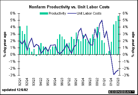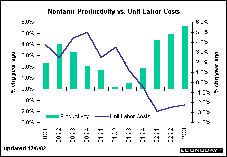 Nonfarm productivity increased at a 5.1 percent rate in the third quarter of 2002, surpassing the modest 1.7 percent pace recorded in the second quarter, but still less than the shopping 8.6 percent spurt posted in the first quarter. Looking at the yearly percent change tends to smooth out fluctuations; productivity increased 5.6 percent in the third quarter, 4.9 percent in the second quarter, and 4.4 percent in the first quarter. Productivity typically spurts in the early stages of recovery because employers have picked up production but have not increased the number of workers on staff. Productivity is bound to moderate through the year, but nevertheIess, the productivity figures remain encouraging since productivity growth is associated with dampening inflationary pressures and allowing wages to grow more rapidly.