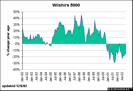 Fed chairman Alan Greenspan set the financial markets on edge several years ago when he first commented on the stock market by making an observation on the "irrational exuberance" of investors. While Greenspan and friends don't tend to comment directly on valuation of stock prices too often, they constantly are talking about the ubiquitous "wealth effect," which allegedly caused consumers to spend more than they earned in income in the late 1990s. There is no question that Fed governors and district bank presidents monitor stock prices closely. The Wilshire 5000 is a broad market indicator that incorporates both the impact from the old economy (such as the Dow Jones Industrials) and the new economy (such as the NASDAQ composite.)