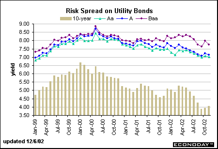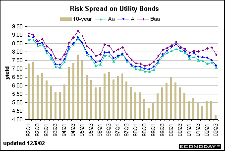 Just like corporate and industrial bonds, the spread between the 10-year Treasury yield and utility bond yields widened sharply in 2000 and 2001. This was mainly due to the diminished supply of Treasury securities, which pushed up their priced and reduced their yield. Although towards the end of 2000 and throughout 2001, it also reflected weakening economic conditions that increased default risk. Incidentally, the Triple A utility bond average is no longer calculated by Moody's because the sample size is too small.
