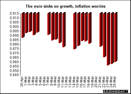 The euro fell on reports showing German and French growth was slower than expected while inflation rose more than expected. This will probably keep the ECB from trying to stimulate the economy in the foreseeable future. Analysts say rising pessimism at German companies and improving sentiment among their U.S. counterparts suggest that the euro's potential to rebound from a six month low against the dollar is limited. The euro sank 2.5 percent against the dollar. The euro's decline followed the lower than expected Ifo reading of 92.5 for April, from 93.9 in March. Meantime, the U.S. NAPM index rose in April to 43.2, from 43.1 a month earlier.