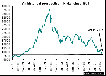 In a sign that the BoJ may work together with the government to write off a sea of bad loans, the Bank said it would buy ¥2 trillion ($16 billion) of shares from banks and urged the government to use taxpayer money. BoJ Governor Masaru Hayami called for banks to properly set aside provisions for bad debts, estimated at ¥52 trillion. The central bank is ready to grant emergency loans and buy stocks to limit losses that have eroded banks' capital. All the talk of bad loans sent the Nikkei to new 19-year lows.