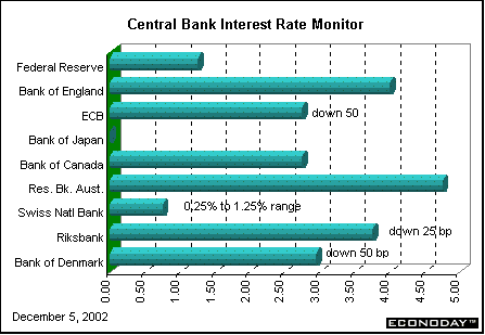 The Bank of England's Monetary Policy Committee announced after its regular monthly rate-setting meeting that it had voted to leave its key interest rate at 4.0 percent. As usual, it gave no explanation for its decision. The Bank last changed its key interest rate in November 2001, when it cut rates by 50 basis points. The last time the BOE left policy unchanged for 13 months in a row was in 1959. Details of the decision will not be available until the minutes of this meeting are published on December 18th. The British economy continues to perk along despite an anemic manufacturing sector.