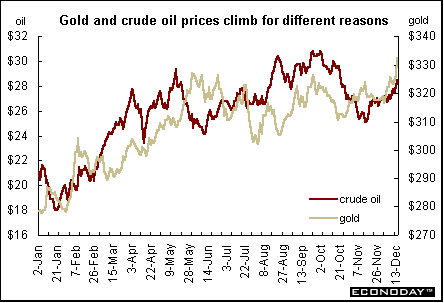 Investors focused in on U.S. growth prospects and didn't particularly like what they saw. The dollar plummeted to three-year lows against the euro, even though growth prospects in Europe are worse than the United States. As military analysts pored over Iraq's extensive dossier, market players became even more edgy about the possibility of a Mideast war. As a result, gold prices shot up (safe haven) and oil prices did the same (possible supply shortage). Talk of biological warfare and the possible response by the U.S. didn't encourage investors to take risks. North Korea's announcement that it was going to start up a nuclear facility alarmed everyone. Gold prices rose to a three-year high on Friday.