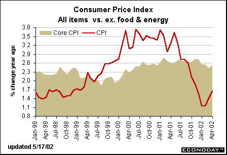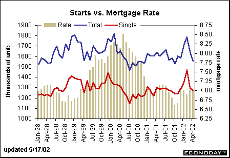 Low mortgage rates continue to benefit the housing market. Admittedly, housing starts fell 5.4 percent in April after an 8.1 percent drop in March. But keep in mind that January and February housing starts were at a two-year high. Even with the two-month drop, total housing starts as well as single-family housing construction remain at the high levels recorded throughout 2001. After all is said and done, it is likely that actual construction was not as strong as the January and February figures suggest. But at the same time, actual construction was probably better than the figures suggest for March and April. The first two months of the year saw an unseasonably warm winter, while March and April are turning out to be relatively normal.