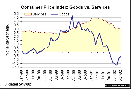 We find that the distinction between changes in prices of goods and services does a better job of distinguishing between core components than the conventional method of just breaking out the food and energy prices. Food and energy are certainly in the goods component, but so are tobacco products. In any case, prices of goods tend to move more dramatically than prices of services over short time frames. Notice how stable prices of services remained throughout 1998 and 1999. These prices then began to increase in 2000 and 2001. Prices of services have since slowed in the past year. Since services account for nearly 60 percent of the CPI, this component is somewhat more relevant than goods in terms of inflationary pressures. If prices of services continue their downward trend, it will help to keep inflation in check over the coming year and give the Fed leeway in determining monetary policy.