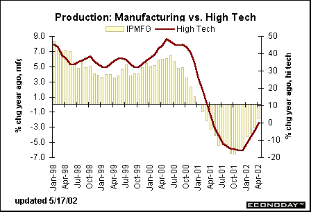 Mortgage rates were at their lowest level in October and November, but even at the recent 7 percent trend they are not particularly high by historical standards. Amazingly, mortgage rates have remained remarkably stable for five months now. This is likely to benefit the housing market in the next few months as well. Continued strength in the housing market should generate higher retail sales for furniture and appliances in the next few months. Early indications show that consumers might start getting more upbeat about the economy. The mid-month reading on the University of Michigan’s consumer sentiment index recorded a mild rise to 96 from a level of 93 in April. Broad consumer spending trends move in tandem with confidence; thus, as consumers become more optimistic in the next few months, that should translate into higher retail sales. Production improves slowly The index of industrial production increased 0.4 percent in April after a downwardly revised gain in March. Production of consumer goods, business equipment and materials managed to post gains for the month. However, production of construction supplies decreased in April. Among the major market groups, only consumer goods are up from year ago levels. Production of business equipment is posting the largest decline from a year ago, down 9.9 percent. Equity investors have been beating up on the high tech area with the Nasdaq composite index feeling the brunt of the blow. Production figures actually have shown pretty healthy gains for selected high tech industries. For instance, this sector has posted an average monthly gain of 1.1 percent since last October. The year-over-year declines have become smaller and smaller and approached zero in April. The chart below shows that growth in high tech production has mirrored growth in manufacturing production. Yet, total manufacturing production is still down 1.9 percent from a year ago while high tech production is only down 0.2 percent through April.