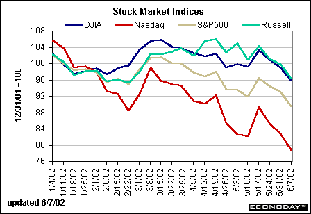 Recap of US MarketsWould Prozac help?Equity investors are simply blue. Earnings are not gathering any momentum and the number of friendly economic numbers are simply insufficient. The employment report was particularly soggy. Until a couple of weeks ago, the small cap sector was managing to avoid the dramatic declines posted in the rest of the market. But in the past couple of weeks, the Russell 2000 has also declined significantly. (Incidentally, the Russell 2000 will soon go through its annual revision. Preliminary additions and deletions that were announced June 7 go into effect on July 1. Final membership lists will be announced on July 9 for the entire family of Russell indexes.)