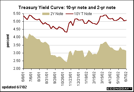 Short and long term yields divergeJudging from the week’s collapse in stock prices, one would expect to have seen a pretty good rally in Treasury prices in the first week of June. In fact, yields on the 2-year and 5-year notes are down modestly from last Friday. However, yields on the 10-year and 30-year securities are actually up a couple of basis points. It is possible that the shorter term instruments are serving as safe-havens, but the longer term securities reflect bond investors’ fear that inflationary pressures will develop if the Fed doesn’t start raising the federal funds target soon.