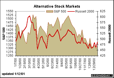 The stock market is off to a rocky start this year, surging on a surprising rate cut by the Fed and sinking back on poor corporate earnings. This week, market players appeared to ignore earnings warnings as the NASDAQ composite managed its big (yet brief) winning streak. Most major averages slipped Friday, and the Dow once again under performed the Nasdaq composite. For the most part, stock investors have decided that profit figures are going to be soggy through the first half of 2001. Any news that supports growth in the second half of this year is viewed favorably. Market players are also concluding that the Fed will probably lower rates by only 25 basis points at the end of the month instead of by 50 basis points, a popular expectation earlier in the week.