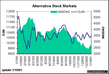 Despite warnings of poor earnings performance among many industries, the NASDAQ composite managed to post pretty good gains for the second straight week. On Tuesday, the composite index dipped slightly but solid gains were posted on Wednesday and Thursday. In contrast, the Dow Jones performance has been choppier since the beginning of the year. Except for a couple of days surrounding the Fed's surprise rate cut, the Dow Jones Industrials have traded below year-end (December 29, 2000) levels through the first three weeks this year. It has also fallen behind other major indexes besides the NASDAQ, including the S&P 500 and Russell 2000.