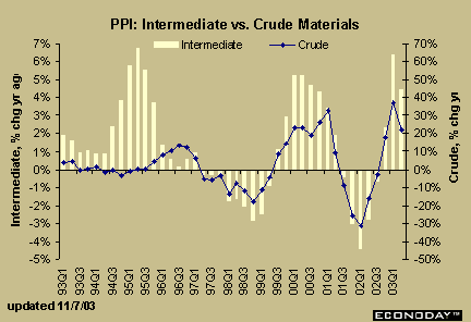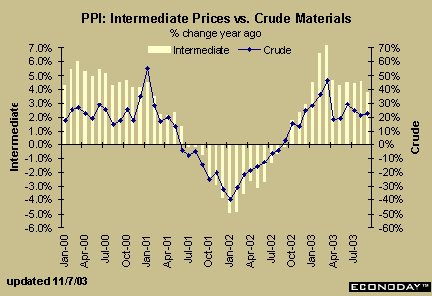 Prices will increase or decrease at earlier stages of production before consumers pay more (less) for finished goods. Changes in prices of food and energy products tend to overshadow changes in prices of other goods. Intermediate goods price gains peaked in 2000 while prices for crude materials were still accelerating until early 2001. Both indices declined in 2001 but staged a turnaround in 2002 and continued to rise in early 2003.