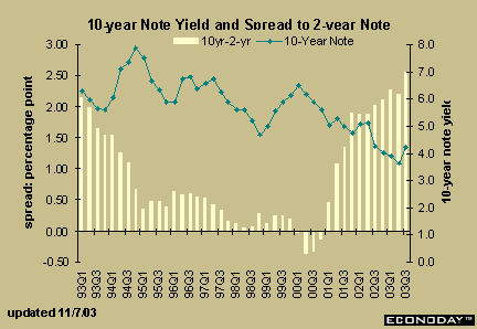 The spread between long and short interest rates tends to widen near economic downturns and narrows during recovery/expansion. The spread narrowed in 1998 and 1999. In 2000, the yield curve inverted. That is, 10-year note yields were lower than 2-year note yields. Often this behavior signals an economic slowdown. This time, the inversion was at least partly due to reduced Treasury borrowing, particularly in the 30-year market. As a result, the 30-year bond began to lose its benchmark status. On October 31, 2001, the Treasury announced the indefinite suspension of the 30-year security altogether. This generated a greater demand for 10-year notes which increased their price and lowered their yields.