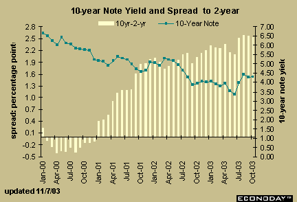 The spread between the 2-year and 10-year notes narrowed by a tick or two in October as long-term rates edged up by a smaller amount than short-term rates.