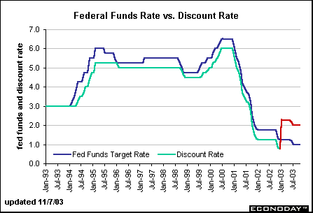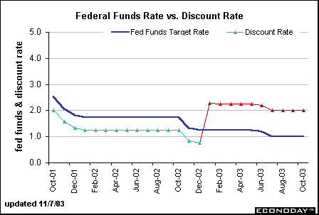 In the old days, the discount rate was considered another policy tool assessable to Fed policymakers. They could lower or raise the discount rate as a signal to indicate easier or tighter monetary policy. In the past ten years, the discount rate was typically just 25 to 50 basis points less than the federal funds rate target. This was to allow banks that needed reserves to borrow cheaply from the Fed. However, banks who did borrow frequently from the Fed were considered poor managers of reserves; consequently, most bankers didn't take advantage of discount window borrowing. On January 9, 2003, the Fed instituted a new policy that would encourage discount window borrowing from banks. The old discount rate is no more. Now, the Fed has a primary credit discount rate and a secondary credit discount rate. The primary credit discount rate is set at 100 basis points over the fed funds rate target. In reality, these are two different series. In order to show the old and the new, we kept the old discount rate in the green and the new discount rate is depicted as a red line.