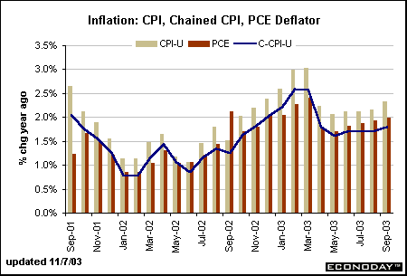 Inflation is always a key indicator among Fed officials. Although the CPI is the most common inflation measure, Fed chairman Alan Greenspan prefers the personal consumption expenditure (PCE) deflator. He believes the latter is more representative of changes in the actual cost-of-living. The discrepancy between the PCE deflator and the CPI widened throughout 2000 and the first half of 2001 perhaps showing a greater shift in the composition of goods and services actually purchased by consumers (towards lower-priced commodities). The PCE deflator incorporates most of the CPI components. Nonetheless, it shows less inflation than the CPI because it also takes into account the fact that consumers substitute lower priced goods for higher priced goods as relative prices change. For example, when the price of chicken falls relative to the price of beef, consumers will buy more chicken. Thus, their actual food costs probably didn't increase as much as indicated by the CPI, which measures a fixed basket of goods and services, and doesn't allow for substitutions.