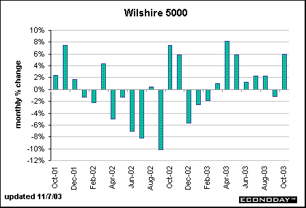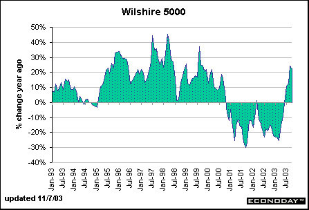 Fed chairman Alan Greenspan set the financial markets on edge several years ago when he first commented on the stock market by making an observation on the "irrational exuberance" of investors. While Greenspan and friends don't tend to comment directly on valuation of stock prices too often, they constantly are talking about the ubiquitous "wealth effect," which allegedly caused consumers to spend more than they earned in income in the late 1990s. There is no question that Fed governors and district bank presidents monitor stock prices closely. The Wilshire 5000 is a broad market indicator that incorporates both the impact from the old economy (such as the Dow Jones Industrials) and the new economy (such as the NASDAQ composite.)