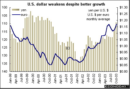 The dollar has stabilized somewhat over recent weeks as U.S. growth prospects have improved and overseas investors have become less dollar negative. But the dollar has lost value against all the major currencies including the euro, yen, Swiss franc, and British pound sterling. The erosion of the U.S. dollar's value is an example of a trend that has characterized currency markets recently - the investors' search for yield. Now that equity prices have turned around globally after three years of declines and fears that U.S. interest rates could sink even further have receded, investors are shifting their focus back to growth and future returns despite qualms about the burgeoning twin deficits.